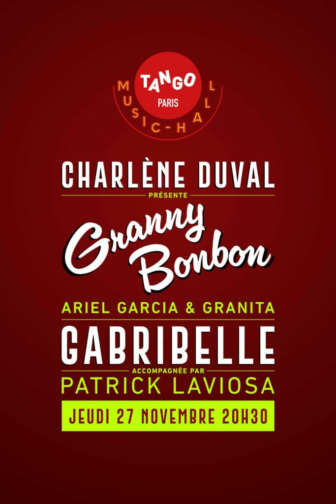 Chanteuse glamour américaine d'un âge certain, qui réalise la tromperie de son agent qui lui a promis des salles prestigieuses. Gabribelle pique comme un cactus, mais peut avoir la douceur d'un doudou usagé. tout est question de dosage. N'y voyez pas qu'une voix et une silhouette. Elle pense, et le public ne s'y trompe pas. C'est une vraie ! (Une vraie quoi ? On ne sait toujours pas). Charlène Duval est heureuse de recevoir ces 2 artistes, et ne manquera pas d'ouvrir cette nouvelle saison des Music-hall du Tango Paris en chansons. Le talentueux Patrick Laviosa accompagnera Charlène et Gabribelle au piano, garantie de qualité pour public exigeant !